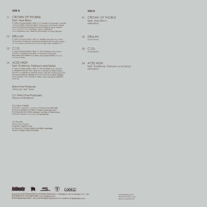 A01.CROWN OF THORNS FEAT. ALOE BLACC A02.DELILAH A03.C.T.D. A04.ACES HIGH FEAT. EVIDENCE, FASHAWN AND DEFARI B05.CROWN OF THORNS FEAT. ALOE BLACC - INSTRUMENTAL B06.DELILAH - INSTRUMENTAL B07.C.T.D. - INSTRUMENTAL B08.ACES HIGH FEAT. EVIDENCE, FASHAWN AND DEFARI - INSTRUMENTAL