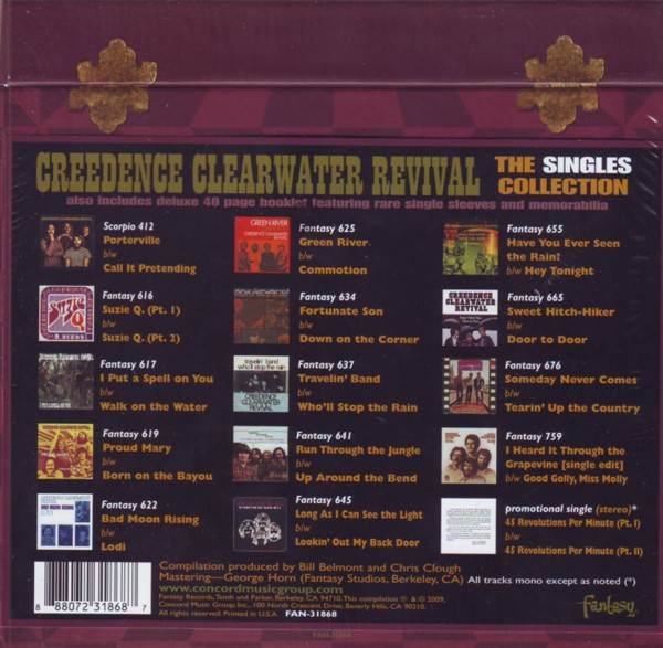 1-A01. Porterville 1-B02. Call It Pretending 2-A03. Suzie Q (Pt. 1) 2-B04. Suzie Q (Pt. 2) 3-A05. I Put A Spell On You 3-B06. Walking On The Water 4-A07. Proud Mary 4-B08. Born On The Bayou 5-A09. Bad Moon Rising 5-B10. Lodi 6-A11. Green River 6-B12. Commotion 7-A13. Fortunate Son 7-B14. Down On The Corner 8-A15. Travelin' Band 8-B16. Who'll Stop The Rain 9-A17. Run Through The Jungle 9-B18. Up Around The Bend 10-A19. Long As I Can See The Light 10-B20. Lookin' Out My Back Door 11-A21. Have You Ever Seen The Rain? 11-B22. Hey Tonight 12-A23. Sweet Hitch-Hiker 12-B24. Door To Door 13-A25. Someday Never Comes 13-B26. Tearin' Up The Country 14-A27. I Heard It Through The Grapevine 14-B28. Good Golly, Miss Molly 15-A29. 45 Revolutions Per Minute, Part 1 15-B30. 45 Revolutions Per Minute, Part 2