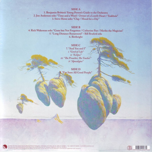 A01. Benjamin Britten's Young Person’s Guide to the Orchestra A02. Jon Anderson solo: Time and a Word/Owner of a Lonely Heart/Teakbois A03. Steve Howe solo: Clap/Mood for a Day B04. Rick Wakeman solo: Gone but Not Forgotten/Catherine Parr/Merlin the Magician B05. Long Distance Runaround / Bill Bruford solo B06. Birthright C07. And You and I a) Cord of Life b) Eclipse c) The Preacher, The Teacher d) Apocalypse D08. I've Seen All Good People