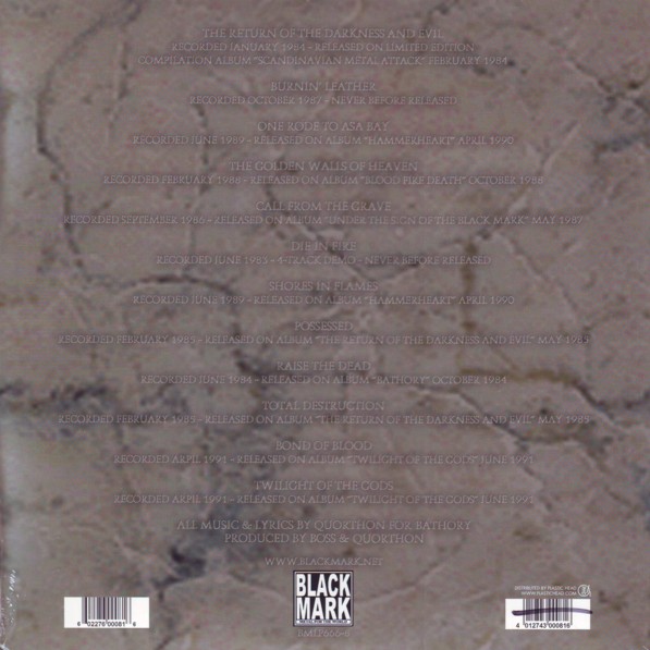 DODATKOWE INFORMACJE 1 nagrano 1984, wydano na składance "Scandinavian Metal Attack", 1984. 2 nagrano w 1987, wcześniej niepublikowamy utwór 3 & 7 nagrano w 1989, wydano na albumie "Hammerheart", 1990. 4 nagrano w 1988, wydano na albumie "Blood Fire Death", 1988. 5 nagrano w 1986, wydano na albumie "Under The Sign Of The Black Mark", 1987. 6 nagrano w 1983, 4-demo, wcześniej niepublikowamy utwór 8 & 10 nagrano w 1985, wydano na albumie "The Return", 1985. 9 nagrano w 1984, wydano na albumie "Bathory", 1984. 11 & 12 nagrano w 1991, wydano na albumie "Twilight Of The Gods", 1991.