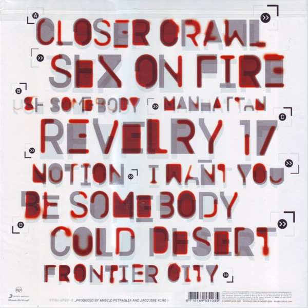 A01. Closer A02. Crawl A03. Sex On Fire B04. Use Somebody B05. Manhattan C06. Reverly C07. 17 C08. Notion C09. I Want You D10. Be Somebody D11. Cold Desert BONUS D12. Frontier City