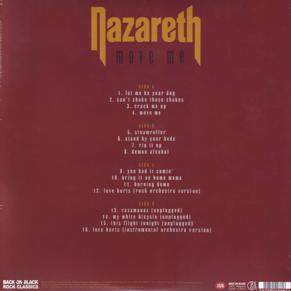 A01. Let Me Be Your Dog A02. Can't Shake Those Shakes A03. Crack Me Up A04. Move Me B05. Steamroller B06. Stand By Your Beds B07. Rip It Up B08. Demon Alcohol C09. You Had It Comin' C10. Bring It On Home Mama C11. Burning Down C12. Love Hurts (Rock Orchestra Version) D13. Razamanaz (Unplugged) D14. My White Bicycle (Unplugged) D15. This Flight Tonight (Unplugged) D16. Love Hurts (Instrumental Orchestra Version)