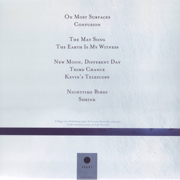 A01. On Most Surfaces A02. Confusion B03. The May Song B04. The Earth Is My Witness C05. New Moon Different Day C06. Third Chance C07. Kevin's Telescope D08. Nighttime Birds D09. Shrink