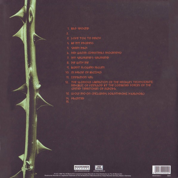 A01. Bad Ground A02. A03. Love You To Death A04. Be My Druidess A05. Green Man B06. Red Water (Christmas Mourning) B07. My Girlfriend's Girlfriend B08. Die With Me C09. Burnt Flowers Fallen C10. In Praise Of Bacchus C11. Cinnamon Girl D12. The Glorious Liberation Of The People's Technocratic Republic Of Vinnland By The Combined Forces Of The United Territories Of Europa D13. Wolf Moon (Including Zoanthropic Paranoia) D14. Haunted D15.