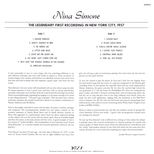 CD: 1. Mood Indigo 2. Don't Smoke In Bed 3. He Needs Me 4. Little Girl Blue 5. Love Me Or Leave Me 6. My Baby Just Cares For Me 7. He's Got The Whole World In His Hands 8. African Mailman 9. Good Bait 10. Plain Gold Ring 11. You'll Never Walk Alone 12. I Loves You Porgy 13. Central Park Blues 14. For All We Know