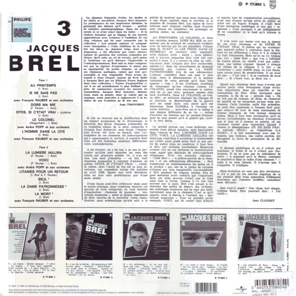 A01. Au Printemps A02. Je Ne Sais Pas A03. Dors Ma Mie A04. Dites, Si C'Était Vrai A05. Le Colonel A06. L' Homme dans La Cité B07. La Lumière Jaillira B08. Voici B09. Litanies Pour un Retour B10. Seul B11. La Dame Patronnesse B12. La Mort
