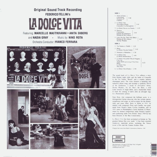 A01. La Dolce Vita / Titoli Di Testa / Canzonetta A02. Cadillac / Arrivederci Roma / Caracalla's A03. Via Veneto / Notturno A04. Patricia / Canzonetta / Entrata Dei Gladiatori / Valzer (Parlami Di Me) A05. Lola (Yes Sir, That's My Baby) / Valzer (Parlami Di Me) / Stormy Weather