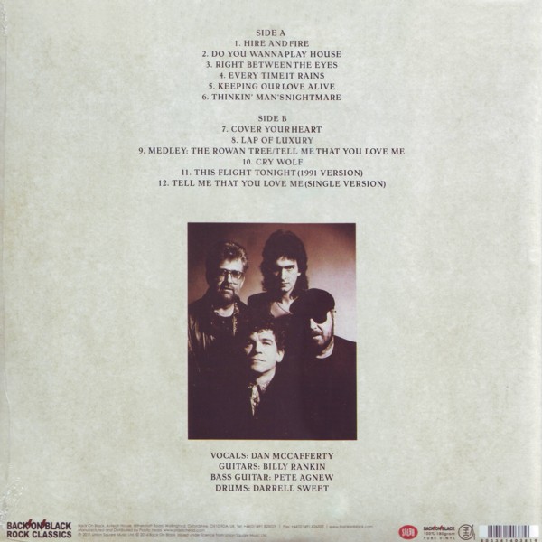 A01. Hire And Fire A02. Do You Wanna Play House A03. Right Between The Eyes A04. Every Time It Rains A05. Keeping Our Love Alive A06. Thinkin' Man's Nightmare B07. Cover Your Heart B08. Lap Of Luxury B09. Medley: The Rowan Tree/Tell Me That You Love Me B10. Cry Wolf B11. This Flight Tonight (1991 Version) B12. Tell Me That You Love Me (Single Version)
