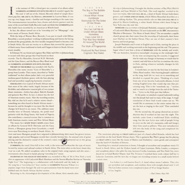 A01. The Boy In The Bubble A02. Graceland A03. I Know What I Know A04. Gumboots A05. Diamonds On The Soles Of Her Shoes B06. You Can Call Me Al B07. Under African Skies B08. Homeless B09. Crazy Love' Vol. II B10. That Was Your Mother B11. All Around The World Or The Myth Of Fingerprints